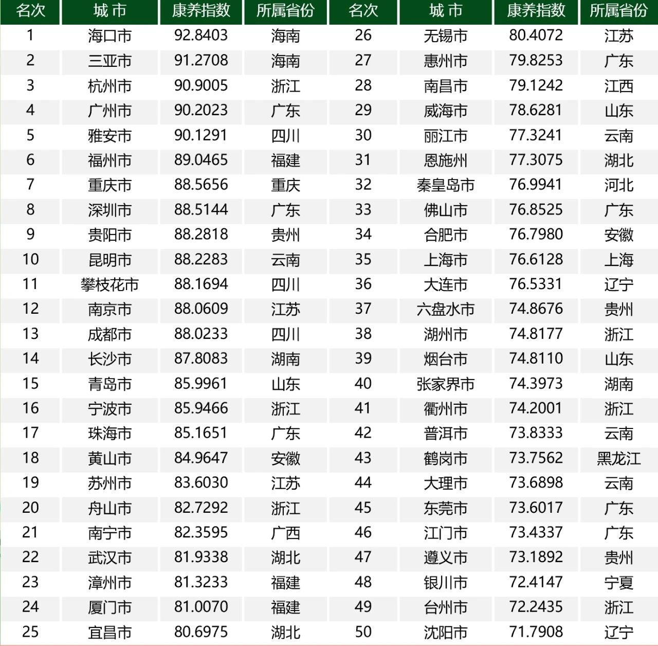 12月12日,在北京召开的第二届康养中国论坛上,标准排名城市研究院、中健联康养研究院联合发布了“2023年中国康养城市排行榜”。榜单显示,海口市、三亚市、杭州市、广州市、雅安市、福州市、重庆市、深圳市、贵阳市、昆明市成为最新的康养城市十强城市,海口市再次霸榜第一。