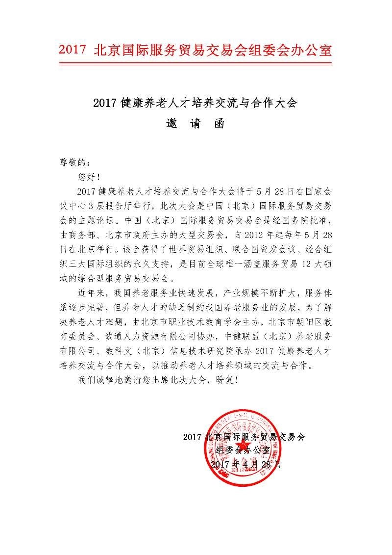 2017北京国际服务贸易交易会期间,5月28日,由北京市职业技术教育学会主办,北京市朝阳区教育委员会、诚通人力资源有限公司等协办,中国健康养老产业联盟、中国医院协会企业医院分会、中国林促会生态养老分会等支持,联合新华养老、国搜养老、中国报道等媒体支持,中健联盟承办“2017健康养老人才培养交流与合作大会”,此次大会将就落实国务院2016年91号文和2017年13号等文件精神,对当前,我国养老人才面临的严峻形势进行交流、分析,并提出解决方案,同时就养老人才领域的合作,进行交流探讨,准确把握养老人才的发展趋势,找出合适我国现阶段养老人才国际合作模式,打造中国特色的养老人才培养体系,为积极应对老龄化人才难题,寻找有效的养老人才解决方案。