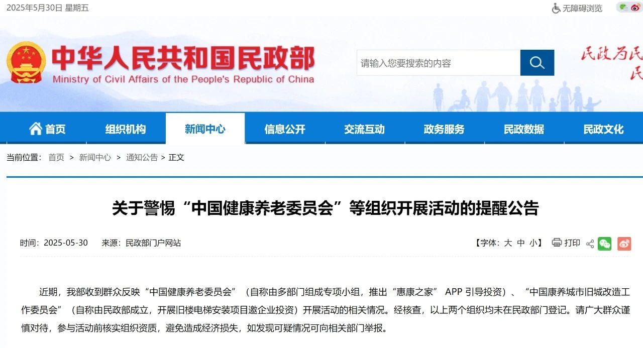近期,我部收到群众反映“中国健康养老委员会”(自称由多部门组成专项小组,推出“惠康之家” APP 引导投资)、“中国康养城市旧城改造工作委员会”(自称由民政部成立,开展旧楼电梯安装项目邀企业投资)开展活动的相关情况。经核查,以上两个组织均未在民政部门登记。请广大群众谨慎对待,参与活动前核实组织资质,避免造成经济损失,如发现可疑情况可向相关部门举报。