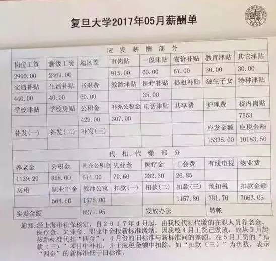 最近一条复旦大学老教授工资条的消息,震惊众人:复旦大学某教授,长江学者,三十年教龄,月工资应发15335元,但实际到手只有8272元,而且是薪酬总数,别的啥都没了!还晒出了教授的薪酬单。